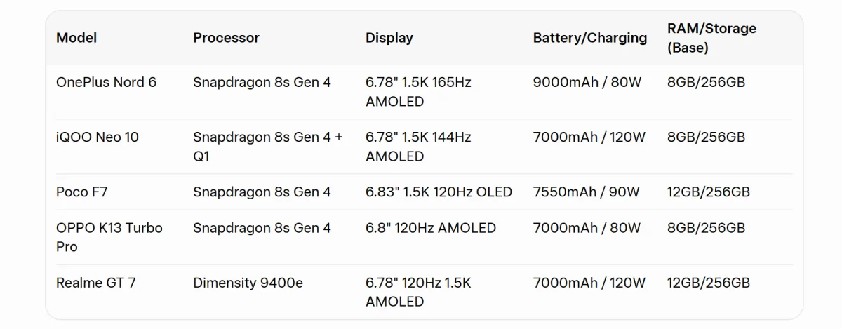 If it's my own money on the line for a pure gaming phone today, the OPPO K13 Turbo Pro is the absolute king. Putting a real physical cooling fan inside a phone at this price changes everything. It completely destroys the passive cooling setups on older phones like the OnePlus 13R. But I'm also really impressed by the OnePlus Nord 6. A 9000mAh battery paired with clean software makes it an amazing buy if you game a lot but still want a reliable daily driver. I'd skip the Realme GT 7 if audio is important to you, as the speakers sound a bit flat. If you're still torn between two phones, throw them into the Techoper Compare Tool to see exactly what features you get before you pull the trigger.