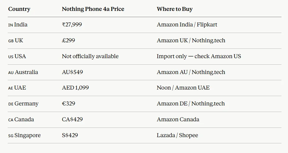 The US market is trickier — Nothing still does not have an official US retail presence, so buyers need to import. Check band compatibility before buying if you are in the US.